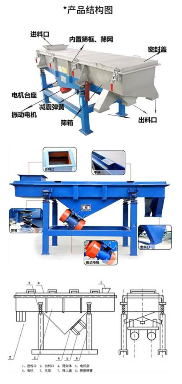 主要由篩箱、篩框、篩網(wǎng)、振動(dòng)電機(jī)、電機(jī)臺(tái)座、減振彈簧、支架等組成。